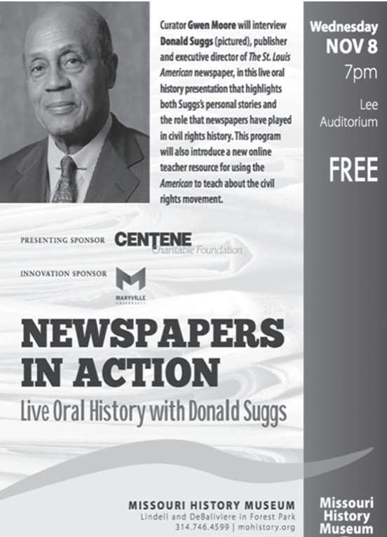 Suggs has also formed a partnership between The American and the Missouri History Museum to further children’s education. During a program at the Missouri History Museum on November 8, Suggs will unveil a new online teacher resource that uses The American to teach students about the civil rights movement. Suggs will also share personal stories and elaborate on the role newspapers have played in civil rights history during this live oral history presentation led by MHM curator Gwen Moore.