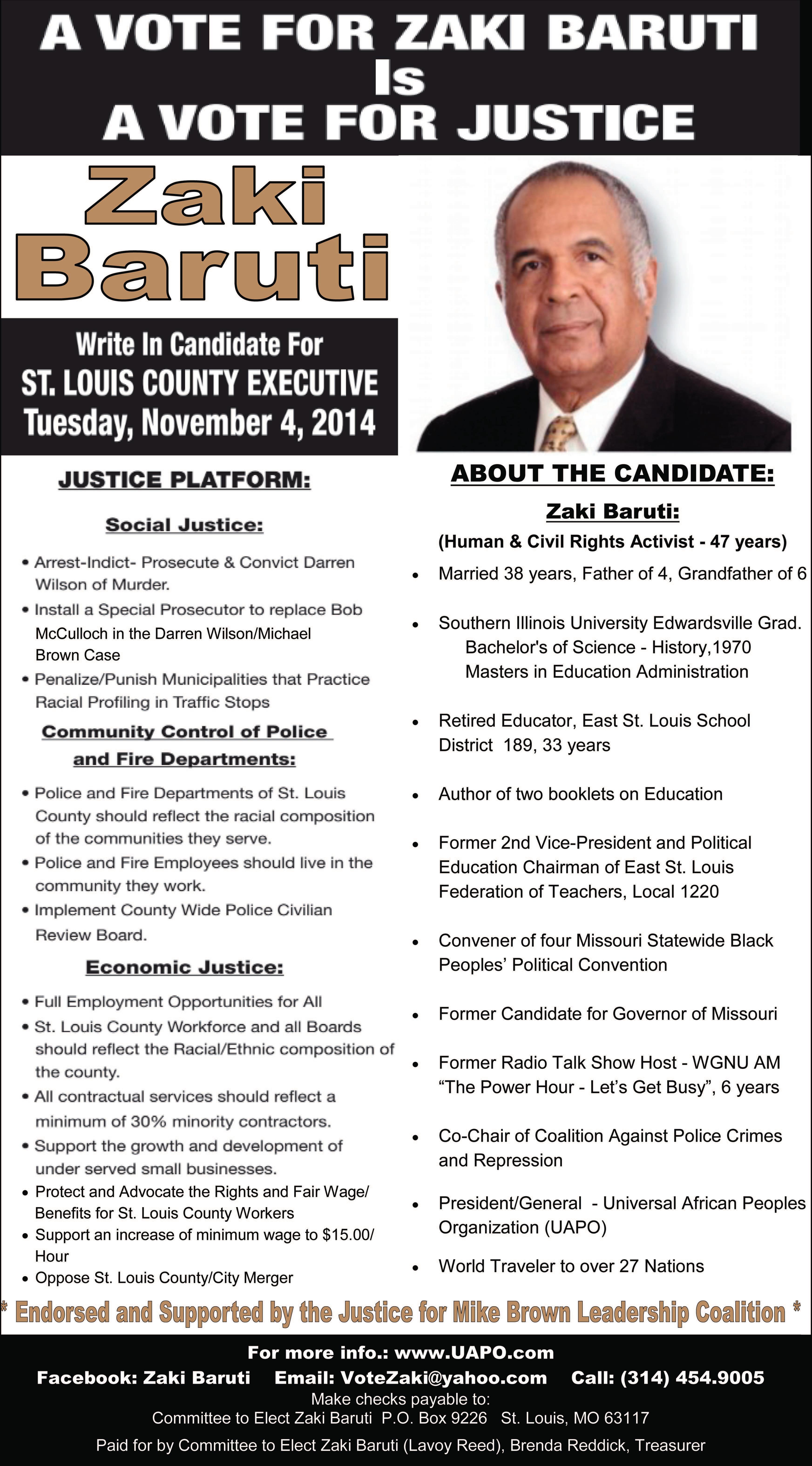 This might lead us to the place some protest activists have reached. Some young protestors claim it was a white police officer, and not poor black voter turnout, that killed Michael Brown, and they refuse to see any connection between voting and forcing the changes they demand. While we clearly understand their sentiment, particularly when faced with a choice between Stenger and Stream at the top of a ballot, we disagree and insist that the power of our vote remains critical to our ability to reshape this county, state and nation. The problem has been that our community has not been sufficiently organized politically to give us better choices on November 4, but this election also marks the beginning of the 2016 election cycle, and now is the time to show our full voting strength. We can have better days ahead for our community, and the ballot box can help us get ahead. We urge everyone to go to the polls and have their voices heard in the November 4 general election.