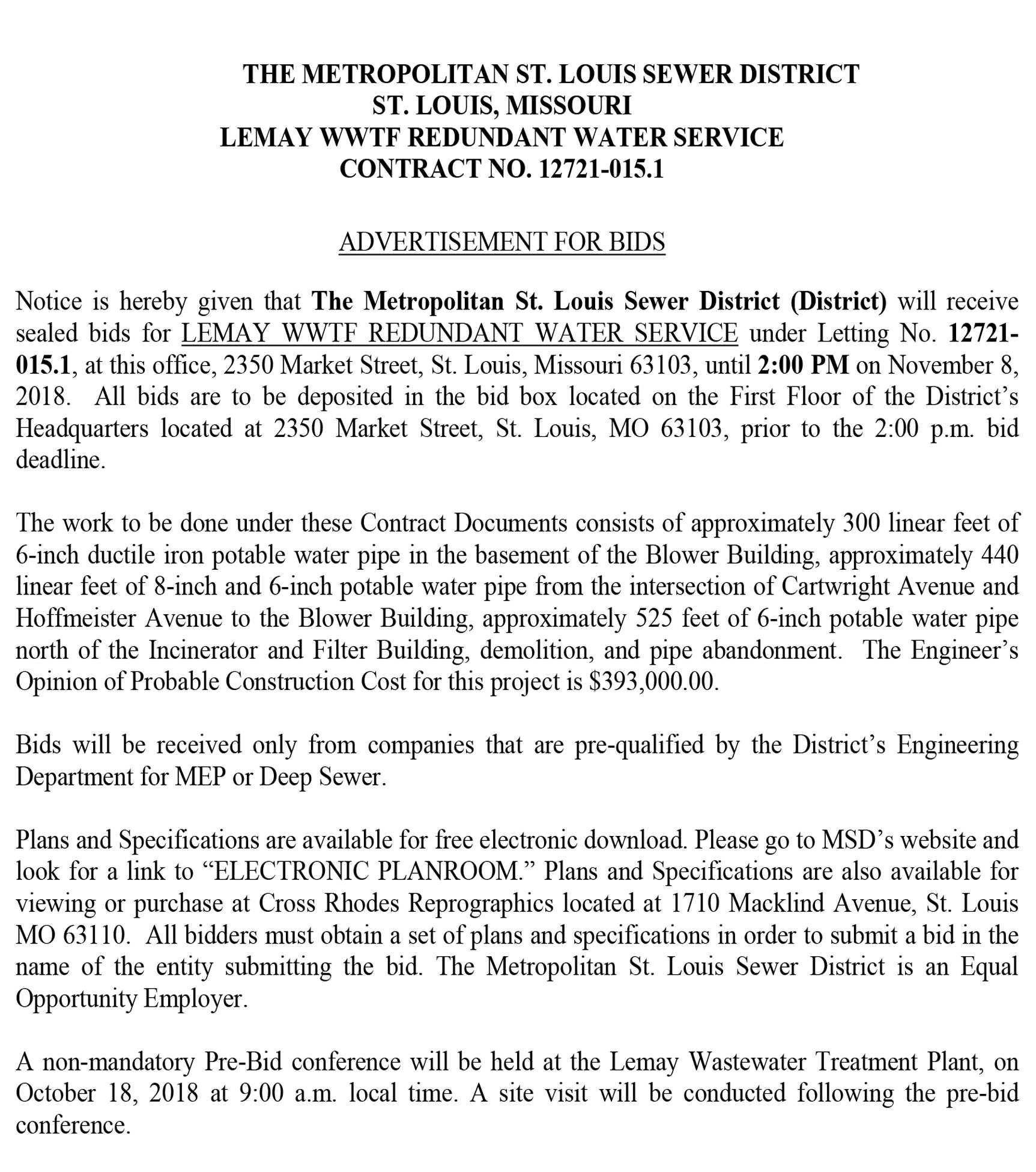 All bidders must regard Federal Executive Order 11246, “Notice of Requirement for Affirmative Action to Ensure Equal Employment Opportunity”, the “Equal Opportunity Clause” and the “Standard Federal Equal Employment Specifications” set forth within and referenced at www.stl-bps.org (Announcements). A pre-bid conference for all contractors bidding on this project will be held on October 23, 2018 at 10:00 A.M. at the Water Department Pipe Yard Office at 4600 McRee, St. Louis, MO 63110. Attendance to this meeting is a requirement for bidding.