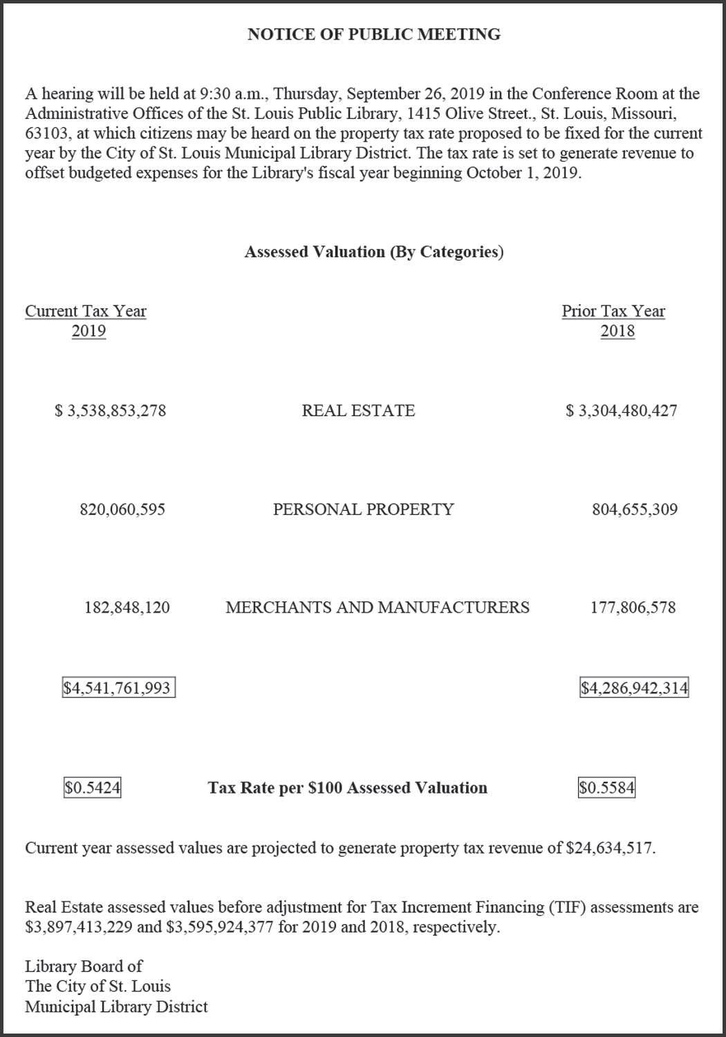 time citizens may be heard on the property tax rates proposed to be fixed for the current year for the Community Mental Health Fund and the Community Children’s Services Fund, by the City of St. Louis Mental Health Board. The tax rate shall be fixed to produce revenues which the budgets for each fund for the fiscal year beginning July 1, 2019 show to be required from the property tax. For the Community Mental Health Fund a rate of $0.09 on each $100 assessed property value was authorized by the vote of the people on November 3, 1992. For the Community Children’s Services Fund a rate of $0.19 on each $100 assessed property value was authorized by the vote of the people on November 2, 2004. The maximum tax rate permitted by Article X, Section 22 of the Missouri Constitution and Section 137.073 R.S.Mo for the Community Mental Health Fund is $0.0870,