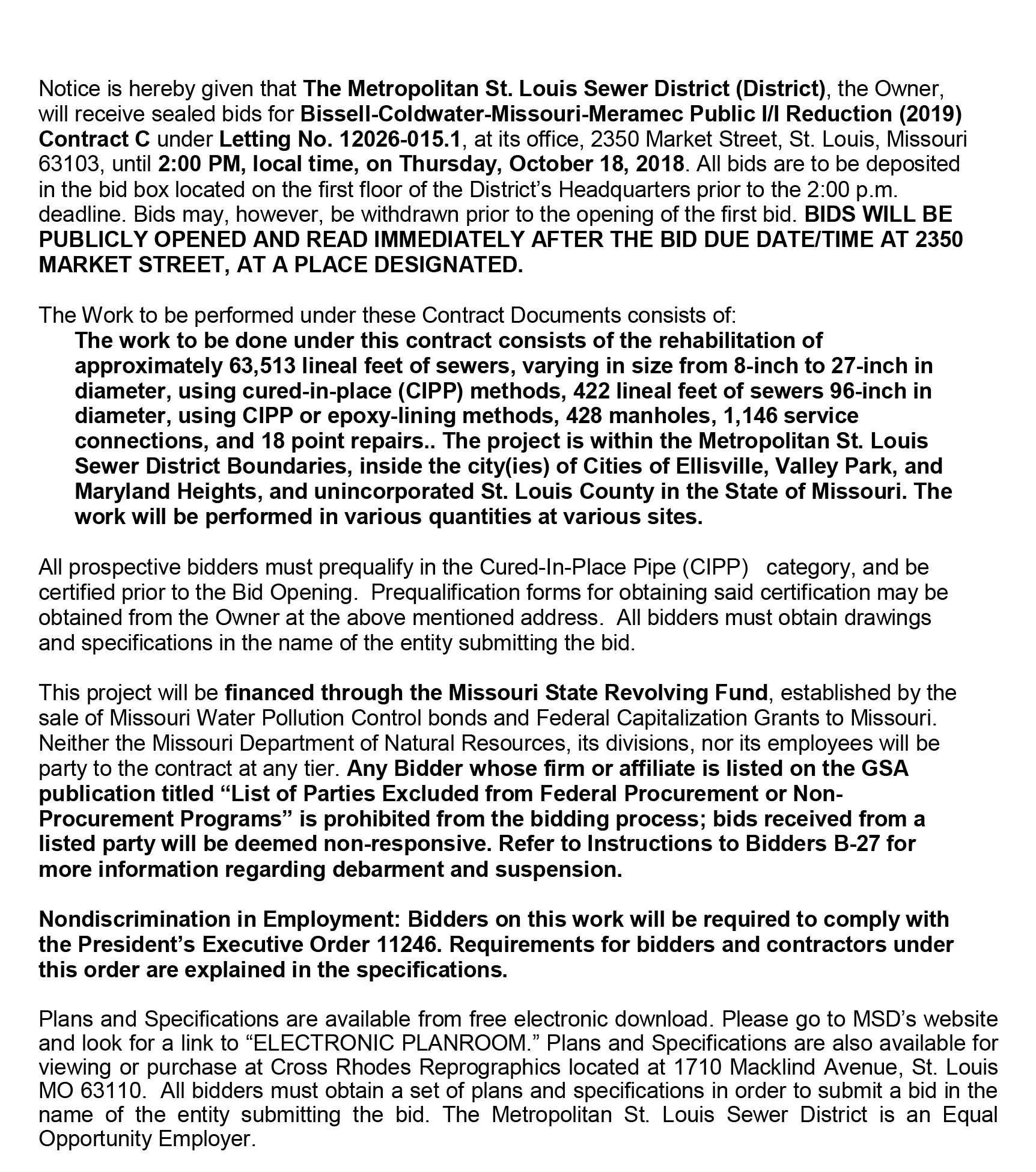 Notice is hereby given that The Metropolitan St. Louis Sewer District (District) will receive sealed bids for Patrina Court Bank Stabilization under Letting No. 11018-015.1, at this office, 2350 Market Street, St. Louis, Missouri 63103, until 02:00 PM on Friday, October 12, 2018, at a place designated. Bids will be received only from companies that are pre-qualified by the District’s Engineering Department for: NATURAL CHANNEL STABILIZATION Plans and Specifications are available for free electronic download. Please go to MSD’s website and look for a link to “ELECTRONIC PLANROOM.” Plans and Specifications are also available for viewing or purchase at Cross Rhodes Reprographics located at 1712 Macklind Avenue, St. Louis MO 63110. All bidders must obtain a set of plans and specifications in order to submit a bid in the name of the entity submitting the bid. The Metropolitan St. Louis Sewer District is an Equal Opportunity Employer.