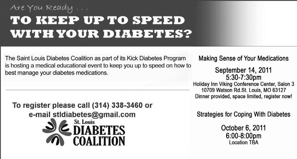 Free, diabetes education program held at various locations by the Diabetes Network of St. Louis. Participants will be offered testing and support for diabetes control. Six sessions will cover monitoring your blood sugar, controlling complications of diabetes, living a healthy life through diet and exercise, and personal goal setting. Call Coco Bopp 314-747-9533 for information.