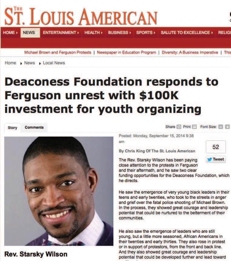 Rev. Starsky Wilson, president of Deaconess Foundation and a pastor in the prophetic tradition that seems so appropriate these days, has shown bold leadership in allocating $100,000 in grants to groom youth organizers and emerging African-American leaders in the St. Louis region. He tells us this initiative grew from his reflection on the crisis in Ferguson, which showed us a generation of raw youth and a cadre of young leaders with potential that could be developed into transformative change agents. “I had to admit,” Rev. Wilson told us, “this was a situation where we needed something more than more social services.”