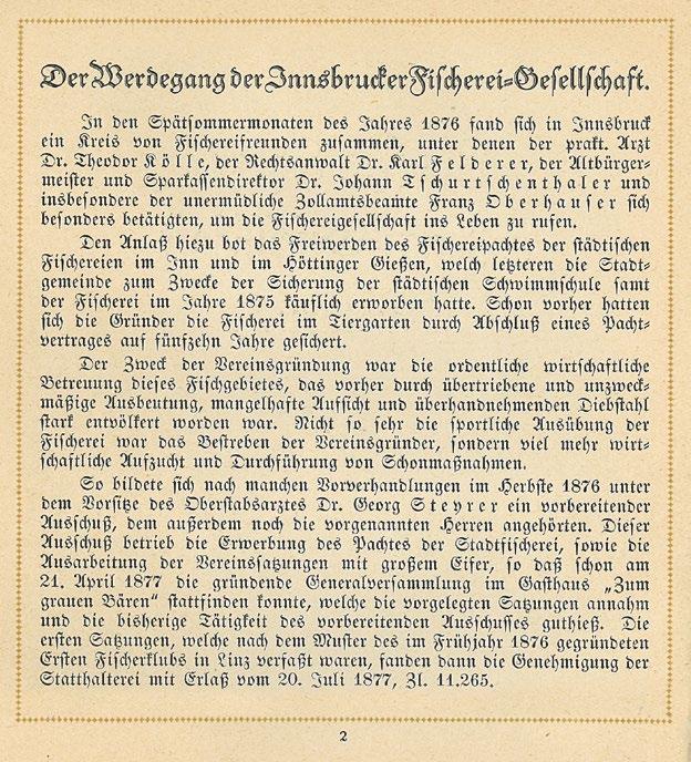 Als sich im Spätsommer des Jahres 1876 in Innsbruck ein Kreis von Fischereifreunden zusammentat, um die Fischereigesellschaft Innsbruck zu gründen, war nicht absehbar, dass dies der Beginn einer einzigartigen 150-jährigen Erfolgsgeschichte sein würde.