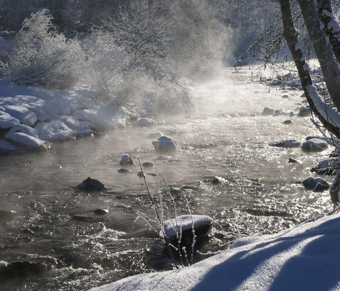 Wasser ist der einzige Stoff der Erde, der natürlich in allen drei Aggregatzuständen vorkommt: fest, flüssig und gasförmig. Am tief winterlichen Bach sogar gleichzeitig.