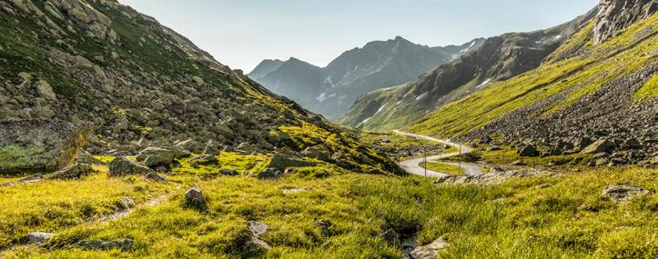 Przepiękna przełęcz z zakrętami z jednej strony oraz łagodnym długim zjazdem z drugiej. I co najważniejsze – bez kabli i słupów elektrycznych, za to z szeregiem krótkich tuneli. Przy jeziorze Steinsee, które kształtem przypomina serce, zaczyna się prywatna droga (5 CHF w parkometrze), a na jej końcu lodowiec mamy już niemal przed nosem. Jako bonus – kilka wodospadów.