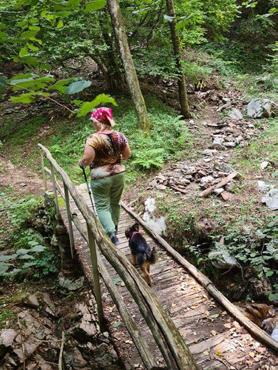 choć to techniczna droga przez las. Po 4 km i przewyższeniu ponad 500 m jesteśmy na miejscu: twarzą w twarz z wodospadami. Było warto. Nad strumieniem chybocze wiszący mostek – to ułatwienie dla dalszych wędrówek. My jednak wracamy.