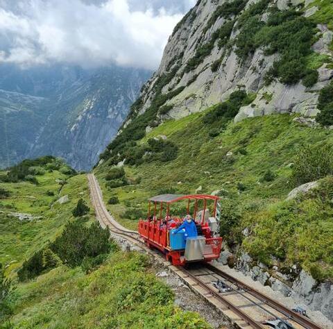 Odkąd podkręcony film z przejazdu kolejką stał się hitem na YouTubie, do tej stacyjki przy drodze na przełęcz Grimsel zaczęły przyjeżdżać tłumy z całego świata. I dlatego też lepiej zarezerwować bilet wcześniej (36 CHF w obie strony, psiak bezpłatnie). Skrzypiący, otwarty wagonik wciągany jest na linie i, faktycznie, w którymś momencie robi się wokół baaardzo przestrzennie. Od