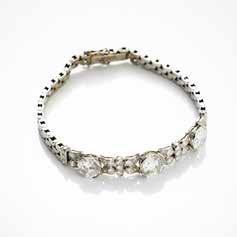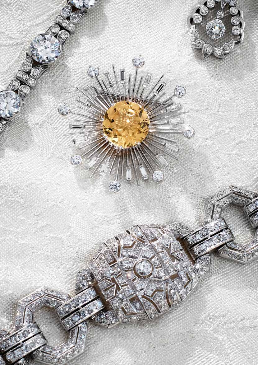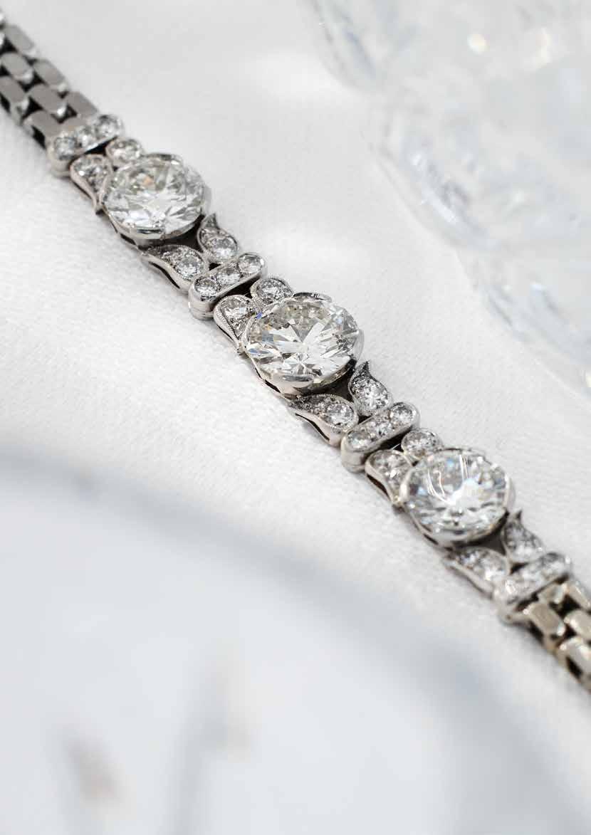 328. ARMBAND, 18 k vitguld, 3 briljantslipade diamanter varav 1 på 2,68 ct, kvalitet W–TCr(H–I)/I, de andra à 2,11 ct vardera, kvalitet W–TCr(H–I)/VS–SI, 60 mindre diamanter med briljant–resp. åttkantslipning, totalt ca 1,84 ct, milligrifferade kanter. Mittparti Belle Epoqué omkring år 1900, armlänk senare, stämplad Gustaf Dahlgren & Co, Malmö 1942, längd ca 19 cm, vikt 24,1 g; etui från W.A. Bolin medföljer. Värdering: 450 000 – 500 000 SEK