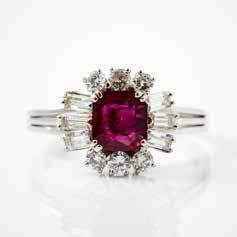 340. RING, 18 k vitguld, 1 smaragdslipad rubin, ca 0,97 ct, 12 diamanter, med baguette– resp. briljantslipning, totalt ca 0,96 ct, kvalitet TCr–CR(I–J)/VS–SI, svensk importstämpel. Ringstorlek ca 18,5 mm, vikt 4 g. Värdering: 10 000 – 12 000 SEK