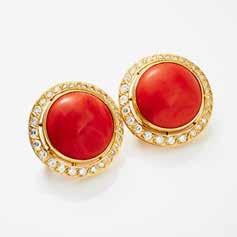 375. ÖRHÄNGEN, 1 par, guld, vardera örhänge med 1 röd cabochonslipad korall, s.k. rosa vivo, bekransade av totalt 60 diamanter med briljant– resp. åttkantslipning, totalt ca 2,00 ct, kvalitet TW–W(F–H)/SI, milligrifferade kanter. Diameter ca 30 mm, vikt 31,3 g.