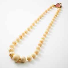 378. COLLIER, doserat, pärlor av vit/ljust rosa korall, 10,48–26,55 mm, lås i förgyllt silver med sockertoppslipad rosenkvarts, Gunnar Fahlström, Stockholm 1971. Längd 68 cm.