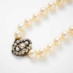 316. BROSCH, 18 k vitguld, mittparti med 3 gammalslipade diamanter, totalt ca 0,70 ct, bekransad av odlade vita saltvattenspärlor, 32 diamanter med gammalslipning resp. åttkantslipning, totalt ca 1,55 ct. Stämplad E. A. Thomasson Ab/C.F. Carlman, Stockholm 1962, längd 35,74 mm, vikt 11,8 g.