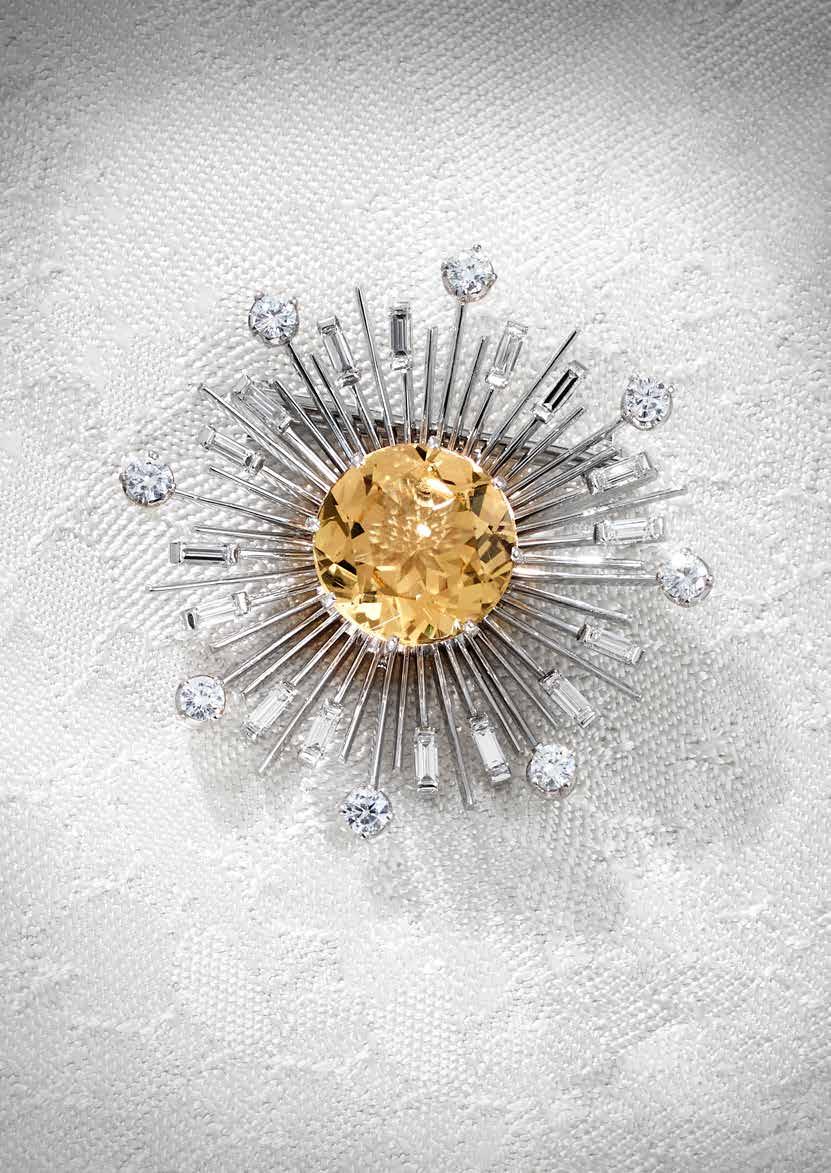 323. BROSCH, 18 k vitguld, dekor av 74 diamanter med briljant–samt åttkantslipning, totalt ca 3,11 ct, varav centersten ca 0,66 ct, C.G. Hallberg, Stockholm 1948, milligrifferade kanter, rörligt genombrutet droppformat hänge, krönt av stiliserat bladverk. Höjd 44,5 mm, vikt 15,1 g.
