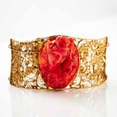 380. ARMBAND, 18 k guld, korallkamé skuren i högrelief föreställande en maenad (bacchante), Michaelsson & Benedicks, Stockholm 1807, empire, länkdelar med intrikat filigrandekor. Längd 18,5 cm, vikt 43,5 g.