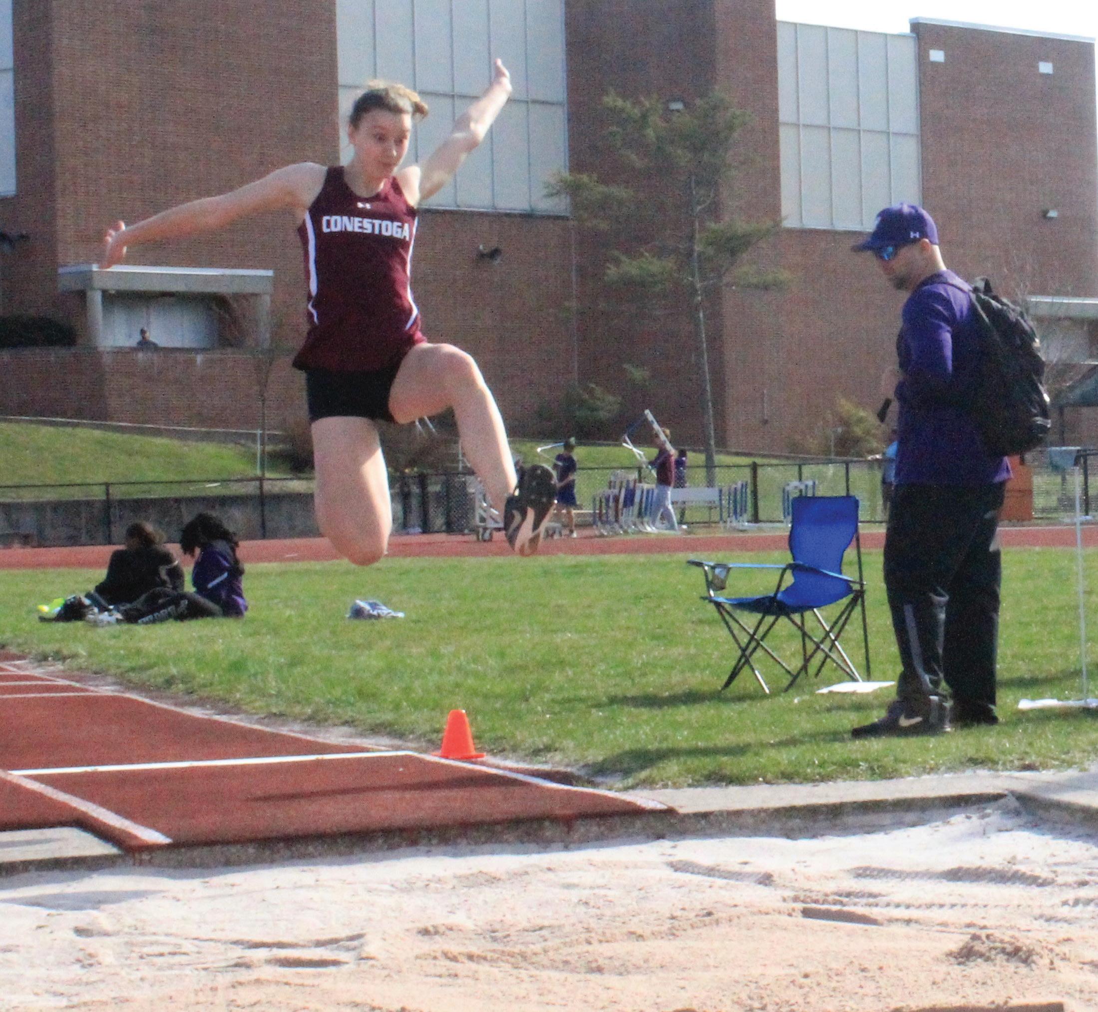 Sprinting down the runway, gaining momentum with each step, junior Lila Ziegler leaps forward from the take-o board, soaring through the air. As she passes the climax of her jump, she braces for the impact, landing in the sandpit at a mark of 17 feet and 5 inches. She executed the longest jump for Conestoga girls in 14 years and the second farthest in its history. Including Ziegler’s achievement, the girls have made three of the top 10 jumps in Conestoga girls track history, with junior Addison Delorefice
