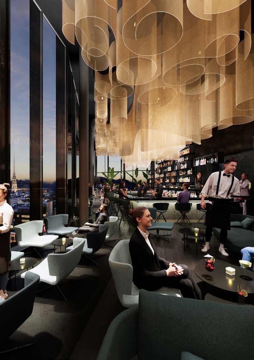 Materialien wurden mit Bedacht gewählt, Bestandsstrukturen neu interpretiert und auf Langlebigkeit und Ressourcenschonung geachtet, ganz im Sinne eines zukunftsfähigen urbanen Lebensraums. Ein zentrales Element ist die nachhaltige Heiz- und Kühlanlage des Towers: Unsichtbar für den Gast, ist die innovative Techniklösung im 26. Stock verankert – ein starkes Zeichen für Effizienz und Umweltbewusstsein auf höchstem Niveau.