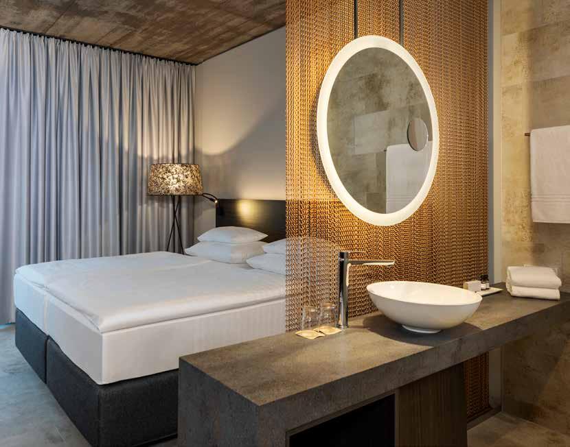 The 189 rooms and suites draw inspiration from the Tabakfabrik’s industrial heritage. Exposed concrete, dark metal accents and high-quality materials in a minimalist design create a sense of urban clarity and understated style. Black stands in contrast with cool stone grey, while bronze details add subtle highlights. Sophisticated interior design, floor-to-ceiling windows and free standing furnishings give the rooms a modern loft feel. A specially themed room interprets Linz as an international creative hotspot – innovative and visionary.