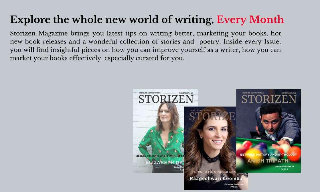 Rekindle your love for books and literature. We bring you the latest releases, interviews and much more from the writing world in our every issue. Get Storizen Magazine delivered to your inbox the moment the issue is released, subscribe now!