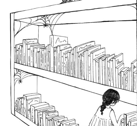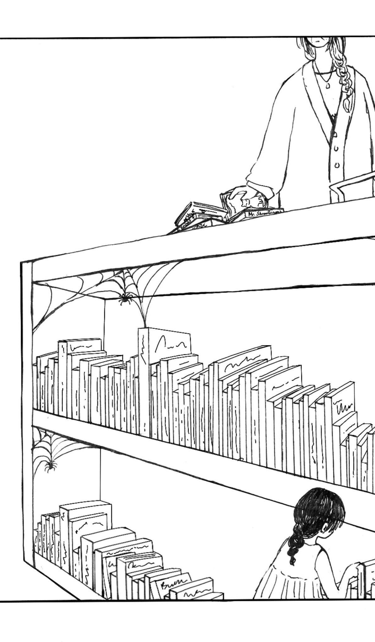 Shroodle’s tail flicked, phasing through a nearby cobweb that hung low from the shelf, no doubt from young patrons pulling with eager hands to claim the shiny, bulbous-eyed spider in its home. Kira’s decorations were