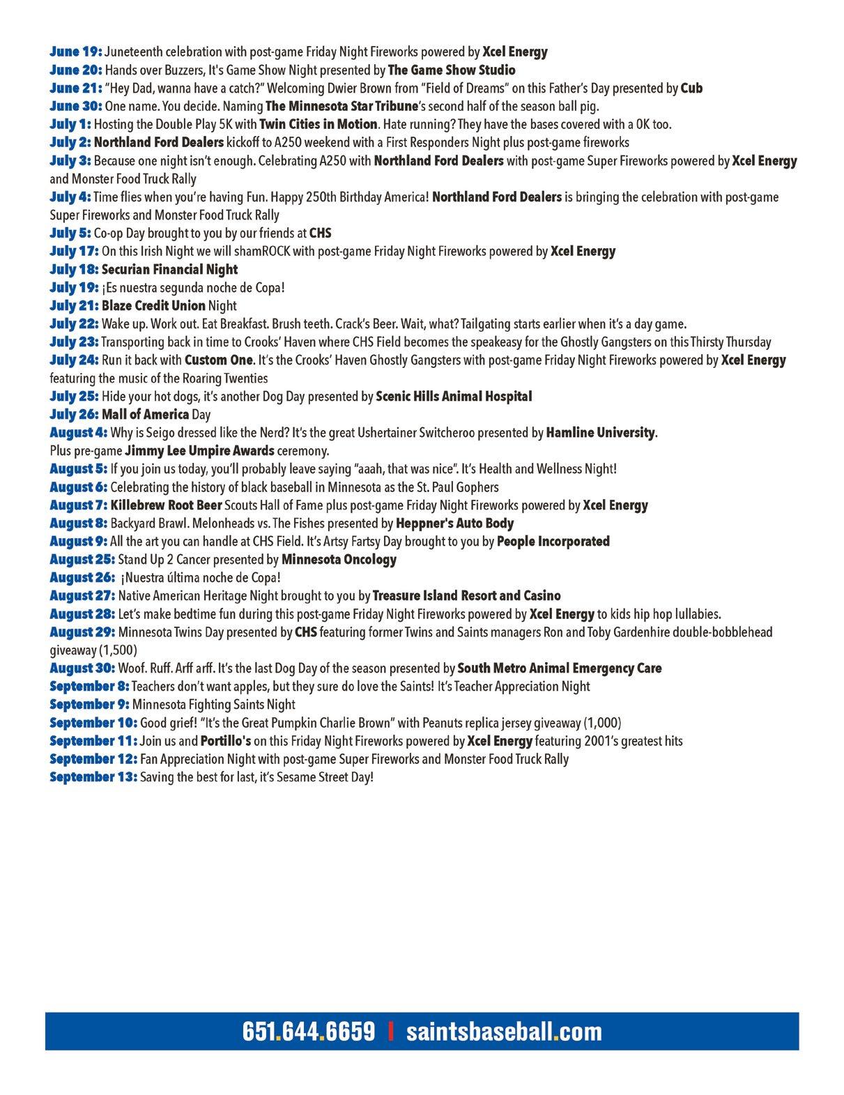 All six Saints weekday afternoon games, three Saturday games, and, 10 Sunday games will be on the CW Twin Cities. Fans can find the CW Twin Cities on the following channels: Comcast 8/1008, DirectTV 23, Dish 23, Charter Spectrum 23/1023, and Over the Air 23.1. Each of the 13 Friday night home games can be found on FOX 9+. Fans can find Fox 9+ on the following channels: Comcast 10/807, DirectTV 29, Dish 29, Mediacom 10/803, Spectrum 10, and Over the Air 9.2. The Saints will carry all Friday Night Fireworks, powered by Xcel Energy, live on FOX 9+ following the game.