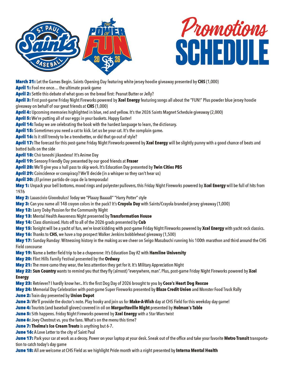 Whether on a big screen, in the palm of your hand, or in your ears, there will be no shortage of ways to follow the St. Paul Saints in 2026. With one of the more expansive TV schedules in franchise history, plus every game over the airwaves, fans can tune into Saints games no matter where they are in the world. A total of 32 of the Saints 75 home games can be seen on the CW Twin Cities and Fox 9+ in 2026. The Saints will also expand their reach around the state working for a second consecutive year with Gray Media. In addition, all 150 games can be heard, once again, on KFAN Plus, 96.7 FM. The entire Saints Broadcast Network is presented by Northland Ford Dealers.