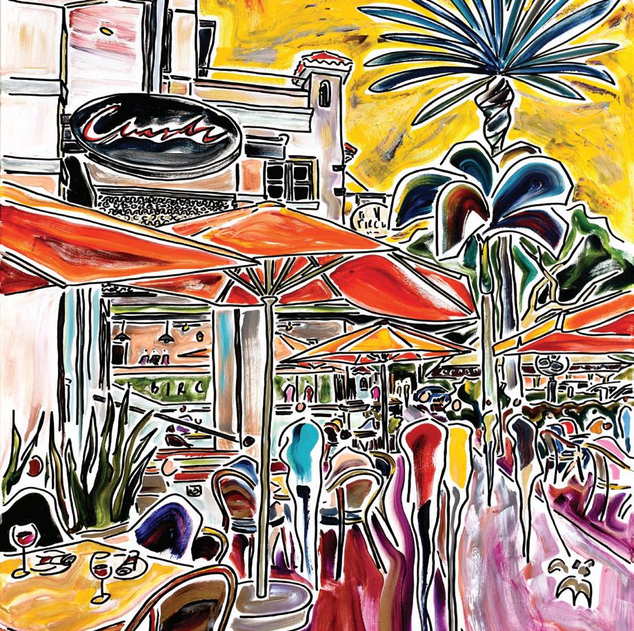 Her city scenes often include recognizable landmarks and carrotshaped people forms (abstract) who are quite often walking their dogs. “I think that’s what makes a city alive,” says the 38-year-old artist in her slight Brazilian accent. “Empty places are sad to me. … I always had dogs growing up and I think they’re part of our cities now more than ever.”