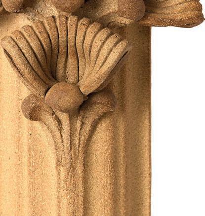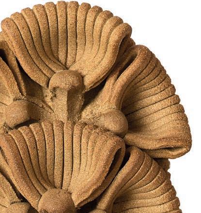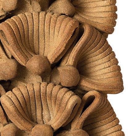 I værker udført i K92- og K58-ler kombinerer Canu håndmodellering med ekstrudering for at skabe strukturelle elementer med skulpturel ornamentik.