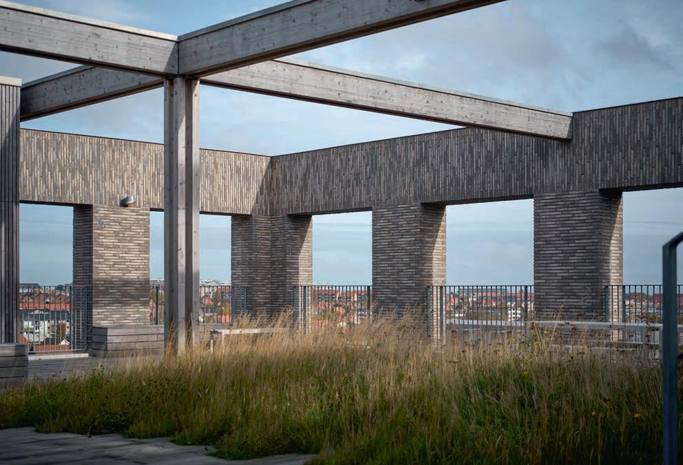 Teglklædte arkader omkring tagterrassen indrammer udsigten over hele Aarhus. Væggene giver læ og skaber en intim atmosfære, til trods for at rummet er åbent mod himlen.