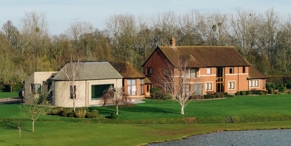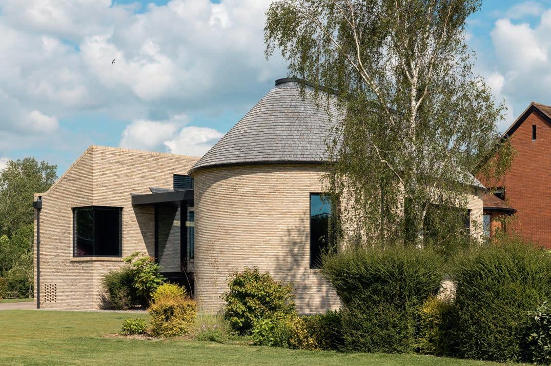 Den lyse tegl indpasser sig farvemæssigt i løvet fra træer, buske og hække. Villaens størrelse brydes op af de mange horisontale og vertikale forskydninger.