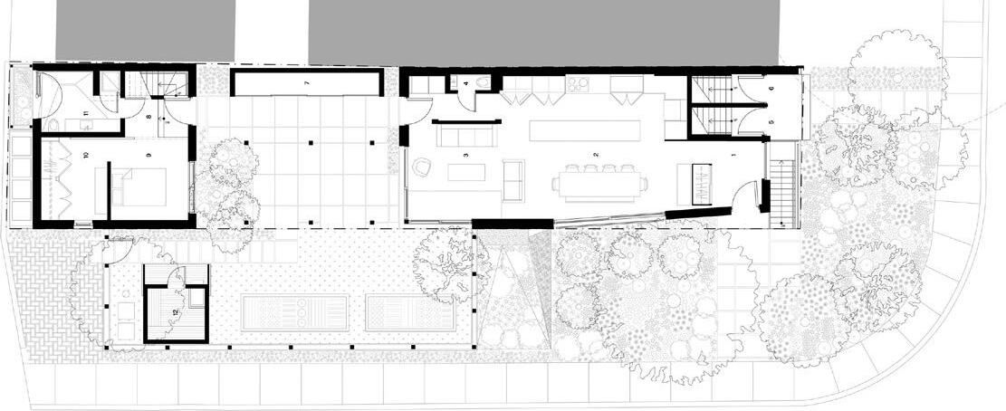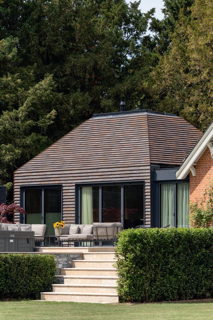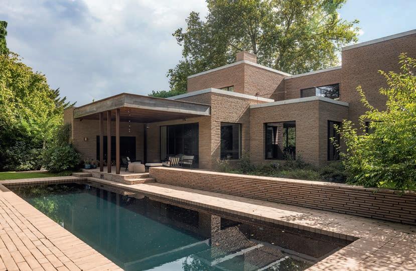 I haven foldes teglfacaden videre ned som belægning på en baldakin-overdækket terrasse og videre ud i græsfladen, hvor den rejser sig til bænke, og hvor formsten etablerer en solid kant til en åbning ned i poolen.