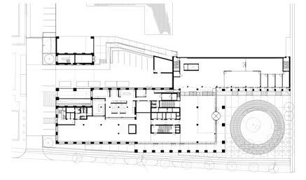 Torvet med den runde fordybning danner ramme om arrangementer for bygningens brugere. Bagerst ligger den eksisterende bygning, der er blevet iklædt et rammeværk af tegl.