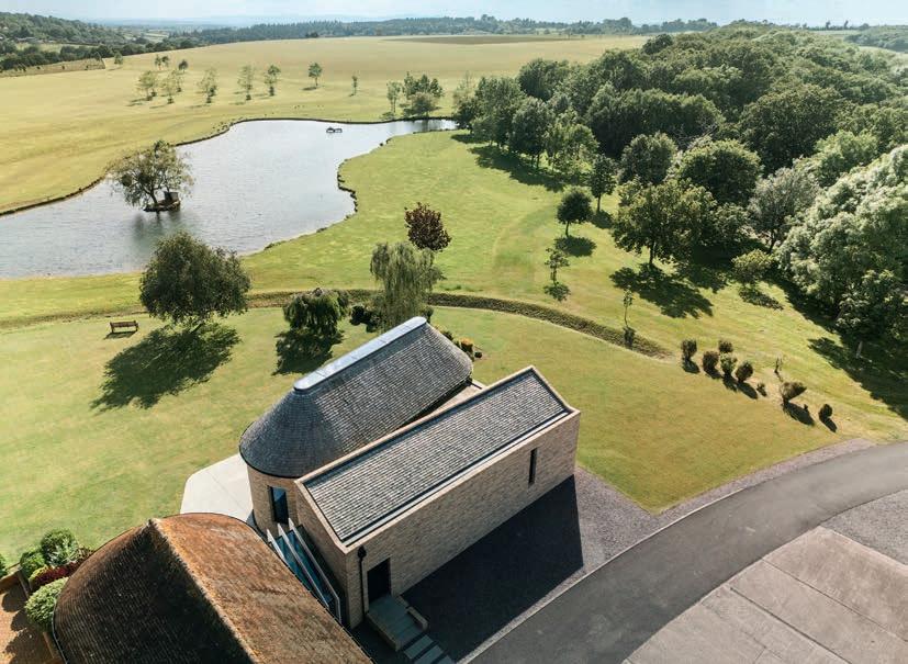 De store terrasser er belagt med naturstenen Pietra dei Medici. Vinduesrammer er udført i patineret kobber, der går igen i sålbænke og murkrone.
