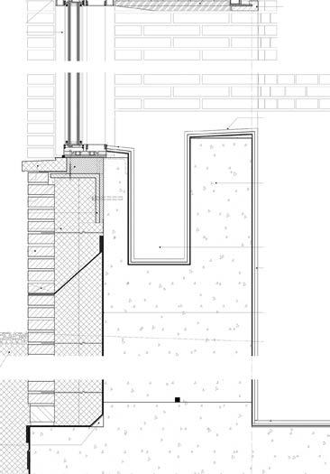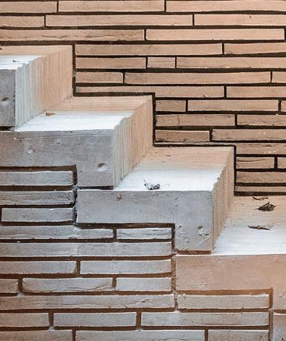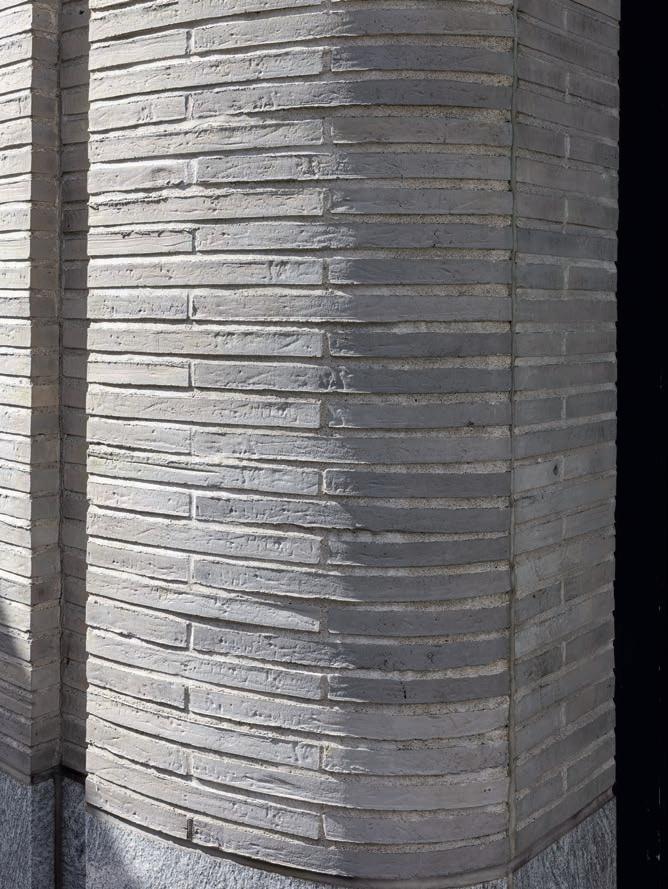 som får en særlig dynamik i dagslys. En række andre, gennemtænkte detaljer udnytter materialets iboende egenskaber. For at reducere skygger på vinduerne rundes murpillerne af med buede sten, der er specialfremstillet til byggeriet, og som fremhæver murværkets skulpturelle potentiale. På hver brystning er de fem øverste skifter trukket tilbage, så kantskiftet danner en markant skyggelinje, der understreger Kolumba-stenens horisontale proportioner. Nederst i brystningerne strækker endnu et kantskifte sig ud til murpillerne, hvor en gennemløbende kanal følger midtlinjen af betonsøjlen og markerer den underliggende konstruktion.