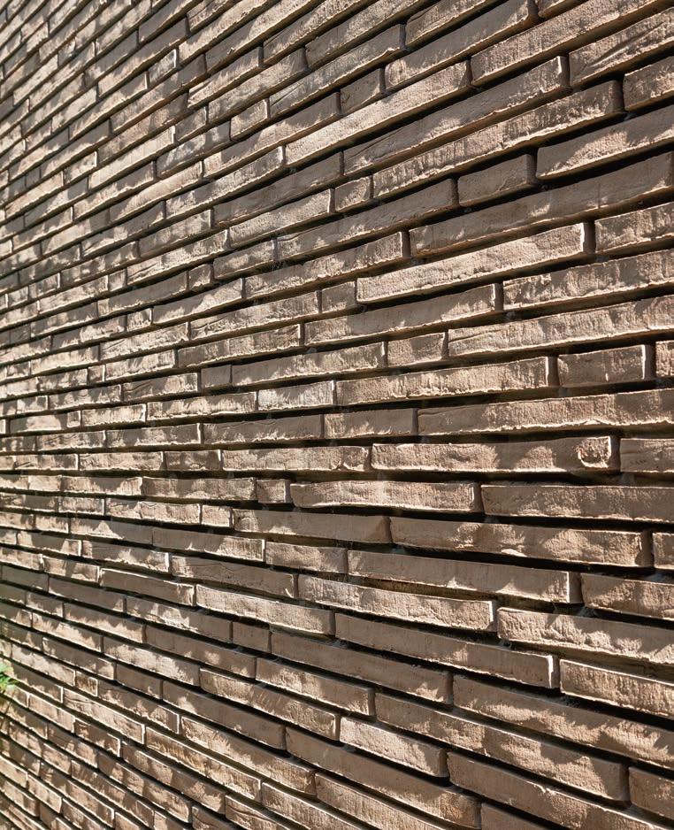 Fugefarven er nøje afstemt med stenen. Vildt forbandt med trykkede liggefuger og studsfuger i plan lader de horisontale linjer dominere murværkets udtryk.