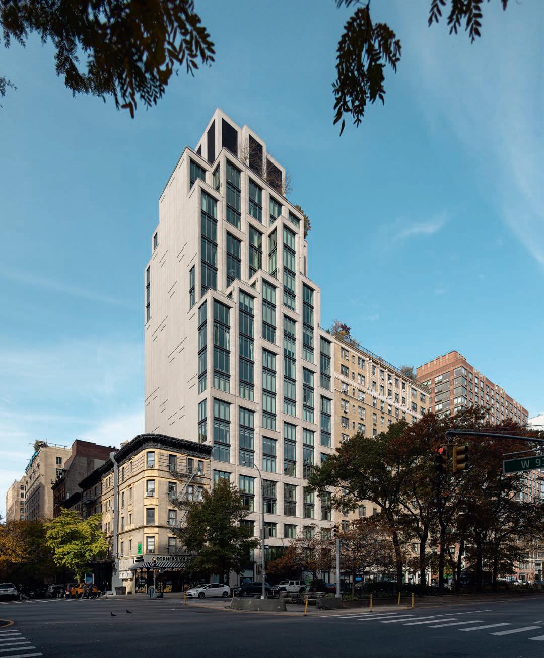 2505 Broadway fotograferet fra vest mod øst. I horisonten yderst til højre ses 180 East 88th Street, tegnet og opført af DDG, der valgte en kombination af lysegrå Kolumba og D-sten i Flensborg-format til den 160 meter høje beboelsesejendom. Ligeledes et spektakulært projekt, beskrevet i Petersens magasin nr. 44.