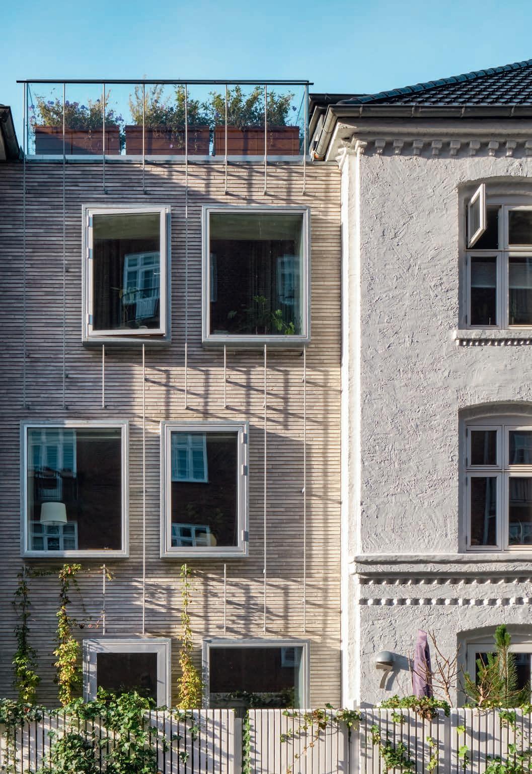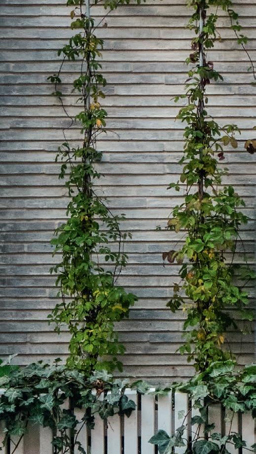 Jævnt over facaden er der monteret lodrette stænger, som klatreplanter med tiden vil gribe fat om og gøre facaden grøn og levende. Planterne er løvfældende, så i sommerhalvåret vil facaden fremstå som en plantevæg, mens murstenene i vinterhalvåret vil træde tydeligere frem bag planternes stængler. »Bagerst har vi den smukke lysegrå mursten, der spiller op imod de lyse, gamle bygninger,« fortæller Martin Krogh. »Oven på den lægger vi et lag af grønt, men vi har fundet en plante, der ikke tager fuldstændig over. Vi har valgt Kolumba-stenen på grund af de gamle huses horisontale træk i kraft af deres gesimsbånd. Kolumba taler samme sprog. Murstenene danner en flade, som fungerer godt med klatrestativerne og det grønne foran. Tilsammen skaber de et flot spil.« De gamle huse har fået en knopskydning, der ikke blot er til glæde for deres beboere, men som også gør gaderummet frodigere.