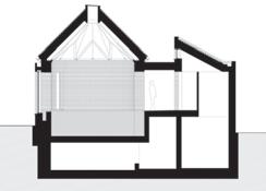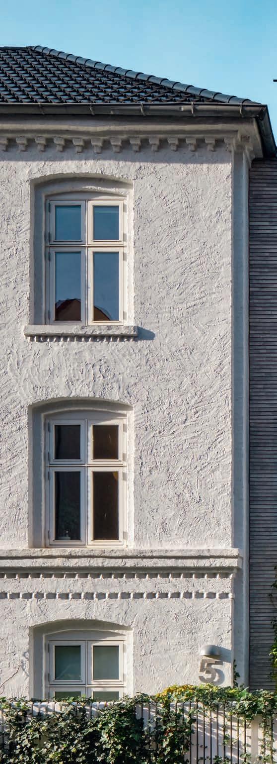 Martin Krogh, arkitekt, stiftende partner i ADEPT og beboer, fortæller: »Vi spurgte os selv, hvordan vi kunne bygge husene sammen på en måde, der var respektfuld over for dem. Så tilbygningen ikke kun opfyldte behovet for ekstra rum, men samtidig gav noget tilbage til byen.« Facaden er derfor muret af en lysegrå Kolumba, der fremstår i et spektrum af forskellige grå toner. Der er anvendt tilbageliggende liggefuger og skrabede studsfuger, så muren danner et fint, horisontalt relief.