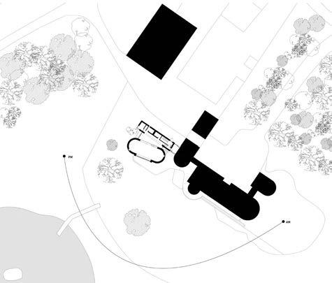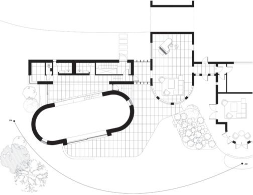 Planen over villaens kælder giver et helt andet billede af boligens egentlige aftryk på grunden. Ser man bort fra pool og havemurenes fundamenter, afsløres et ganske kompakt vinkelhus. I stueplanets generøse og flydende rumprogram opløses grænserne mellem inde og ude via store glaspartier, hvoraf nogle kan skydes til side, når vejret og temperaturen tillader det. Første sal byder på en mere kompakt komposition af værelser og soveværelser med et luksuriøst udbud af badeværelser.