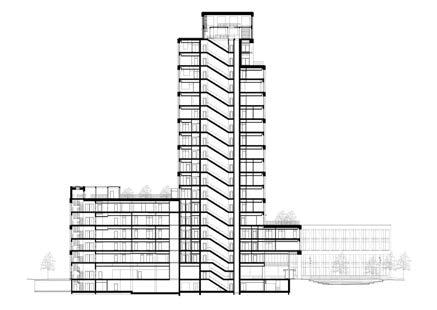 Etagerne er bundet sammen to og to, så de fremstår som dobbelthøje åbninger i murværket. Det forlener bygningen med en vis monumentalitet, men bryder den samtidig ned i skala. Visuelt fremstår den på afstand mindre, da øjet aflæser den som bestående af halvt så mange etager, som der egentlig er. Og samtidig betyder sammenkoblingen, at de enkelte åbninger bliver højere og slankere, som en understregning af bygningens højde.