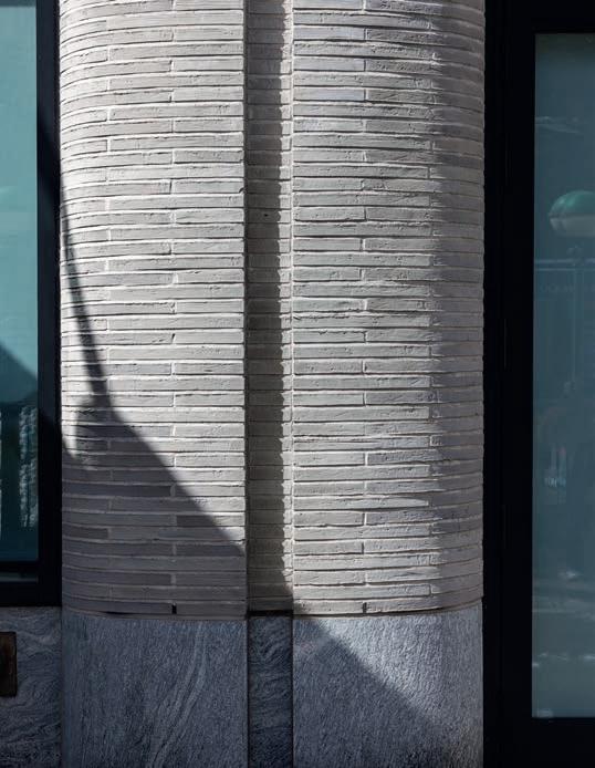 Kolumba-stenen tilføjer facaden stoflighed og rummer et væld af farvetoner. »Stenen er grå, og den har fine variationer i sig og nogle brunlige nuancer, der giver den en grad af varme,« forklarer Anders Tyrrestrup, arkitekt og stiftende partner i Aart: »Kolumba giver huset dets robuste, monolitiske karakter. Når man bevæger sig rundt om det og op på etagerne, er det næsten som at gå rundt langs klippevæggene på et bjerg.«