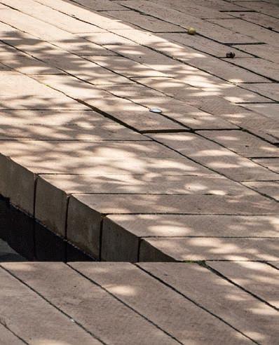 Stigningen i gadeforløbet optages af en sokkel beklædt med lys granit.