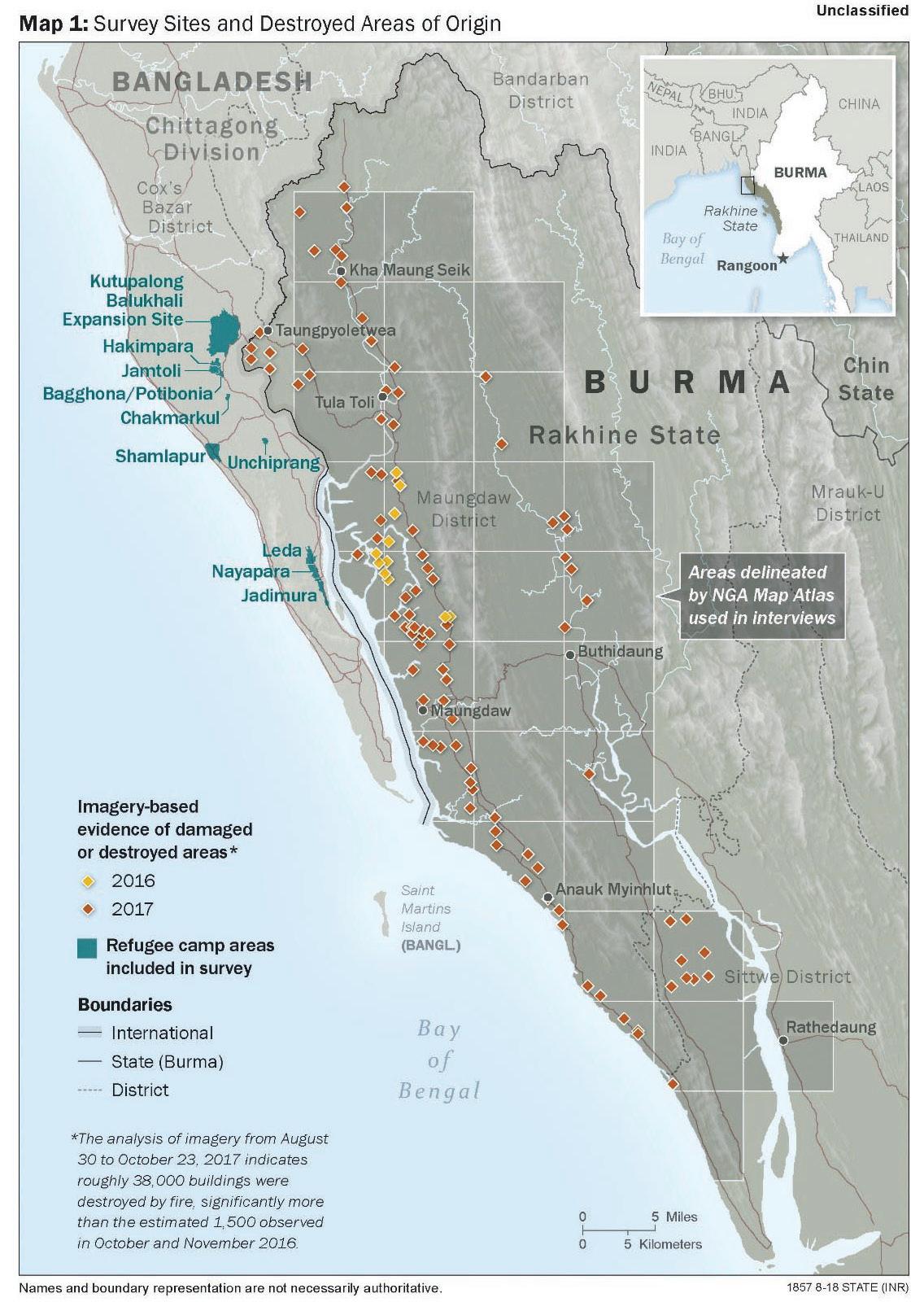 Members of the Myanmar Police Force patrolling in Maungdaw, a town in Rakhine State in the western part of Burma, in September 2017. photo: VOA