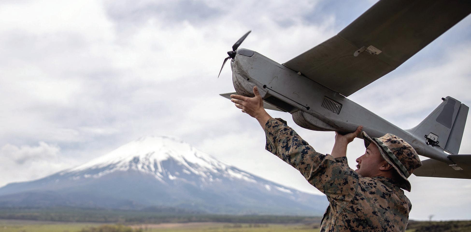 A US Marine launches an RQ-20 Puma drone at Camp Fuji, Japan. photo: Sydni Jessee