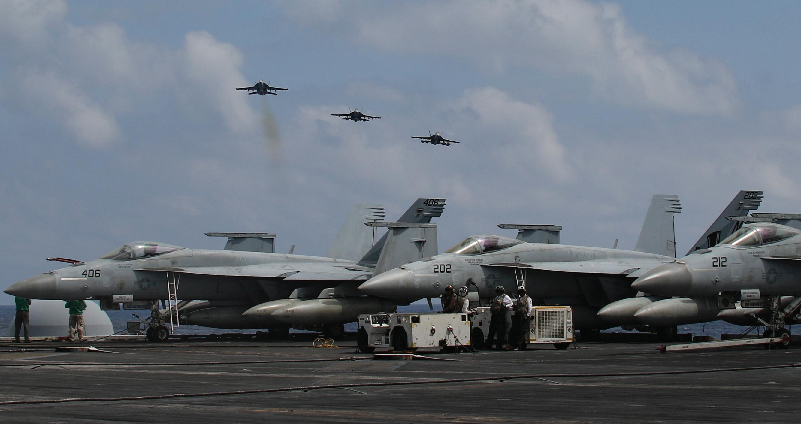 F/A-18E Super Hornets fly in formation during an in-flight change-of-command ceremony over the USS Abraham Lincoln. photo: Julia Brockman