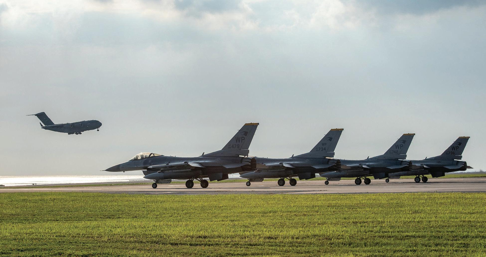 F-16s from the 80th Fighter Squadron are parked at the end of the runway at Kadena Air Base, Japan. photo: Yosselin Perla