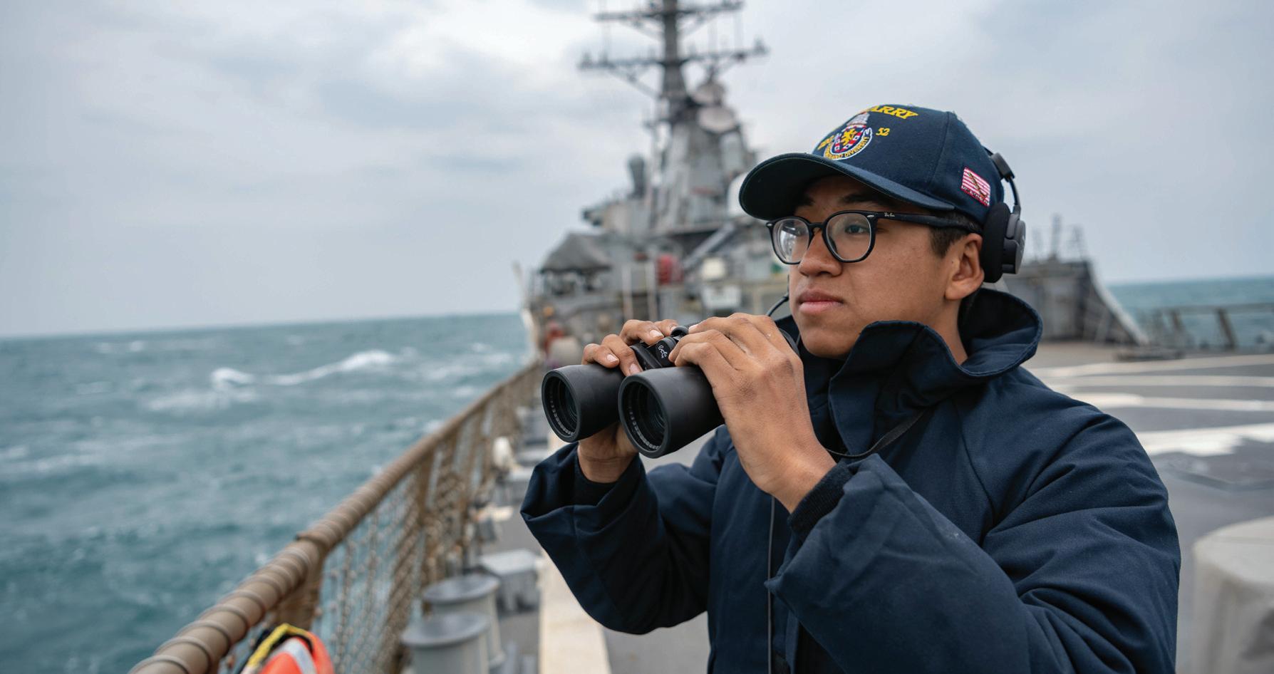 Seaman Xi Chan stands lookout on the flight deck of the guided missile destroyer USS Barry (DDG 52) as it transits through the Taiwan Strait. photo: Samuel Hardgrove