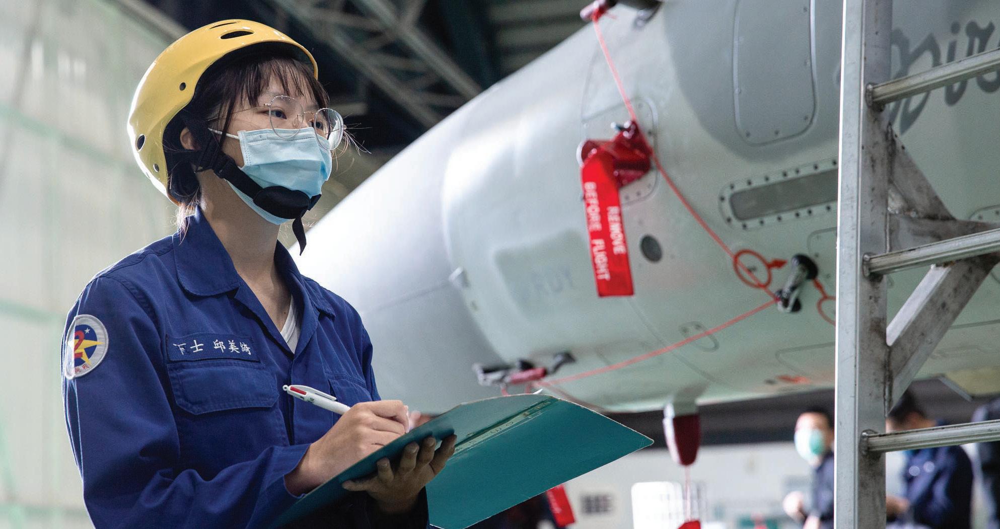 A maintanence officer from the 2nd Tactical Fighter Wing at Hsinchu Air Base, Taiwan, checks a Mirage 2000-5. photo: ROC Presidential Office