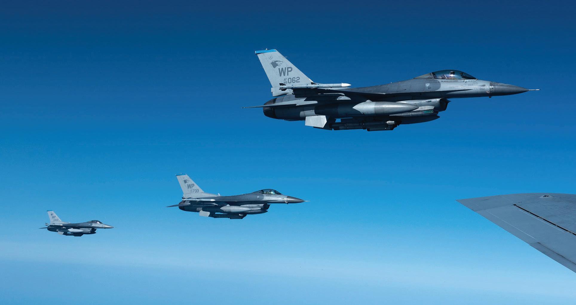 F-16s from Kunsan Air Base, Republic of Korea, wait to take on fuel from a KC-135 in the Indo-Pacific region. photo: Yosselin Perla