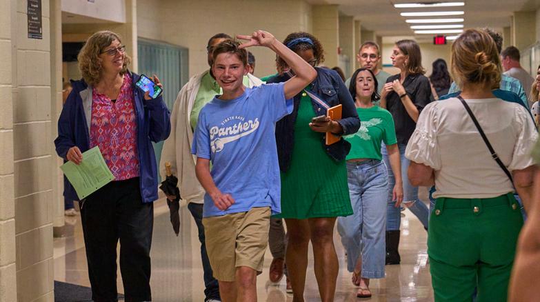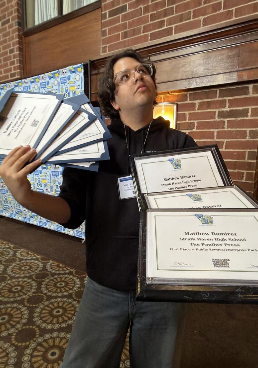 2: Matthew Ramirez (12), Co-Editor-in-Chief of The Panther Press, shows off his various journalism awards from the Pennsylvania News Media Association Student Keystone Press Awards on Tuesday, April 14. Staffers traveled to Harrisburg to attend a networking luncheon and accept their awards. In total, Haven’s newspaper brought home 25 Keystone Awards, including the Sweepstakes Award for the highest scoring student publication in Pennsylvania.